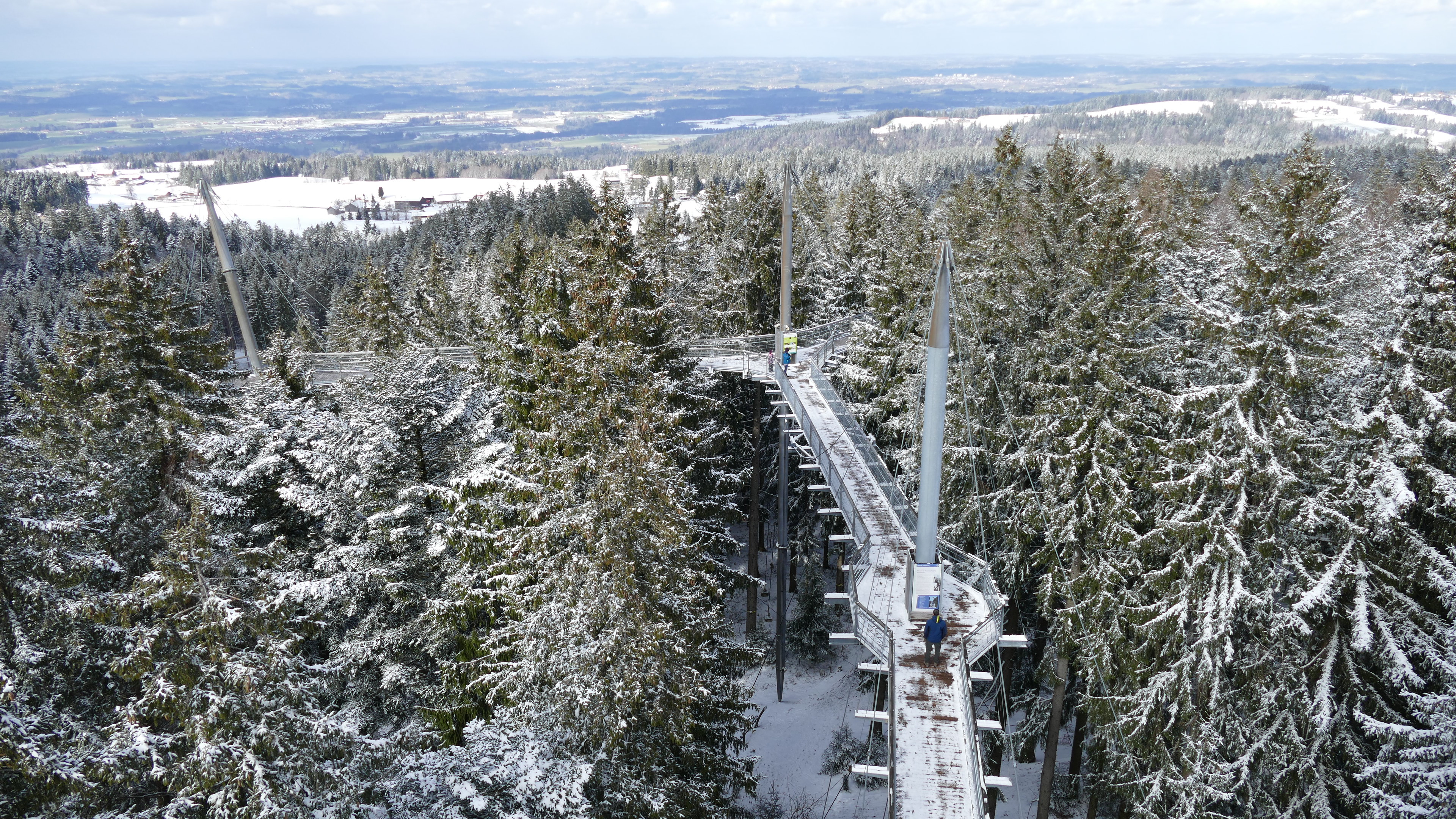 Nach dem Essen geht es dann erst mal bergauf bis zum Eingang des Skywalk. Eröffnet im Okt 2010. Das ist nicht nur ein toll gemachter Baumwipfelpfad, sondern auch ein Erlebnisbereich für Kinder, ein Walderlebnispfad mit Aufgaben, die zu bewältigen sind, Barfusspfad, natürlich einem Spielplatz usw. Die Rutsche am Ende des Wipfelpfads ist erst ab 6 Jahre, aber es gibt auch eine Treppe neben runter. Jetzt war das Kletterstück und die Rutsche gesperrt, eingeschneit. Irgend jemand muss heute morgen schon den Pfad oben gekehrt haben. Für Rollis und Kinderwagen gibt es auch einen Aufzug auf den Turm hoch. Ich habe auch damit 100 Stufen nach oben eingespart 😁. War schon ordentlich bergauf heute. Was jetzt wieder geht, wäre im September unmöglich gewesen.